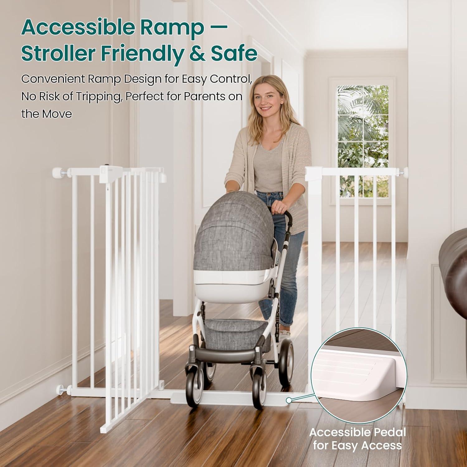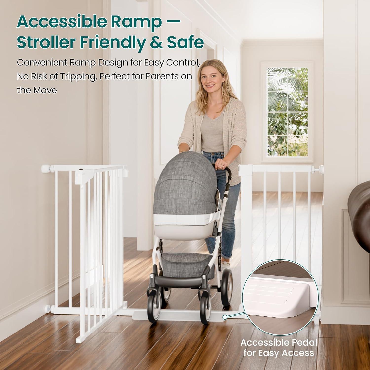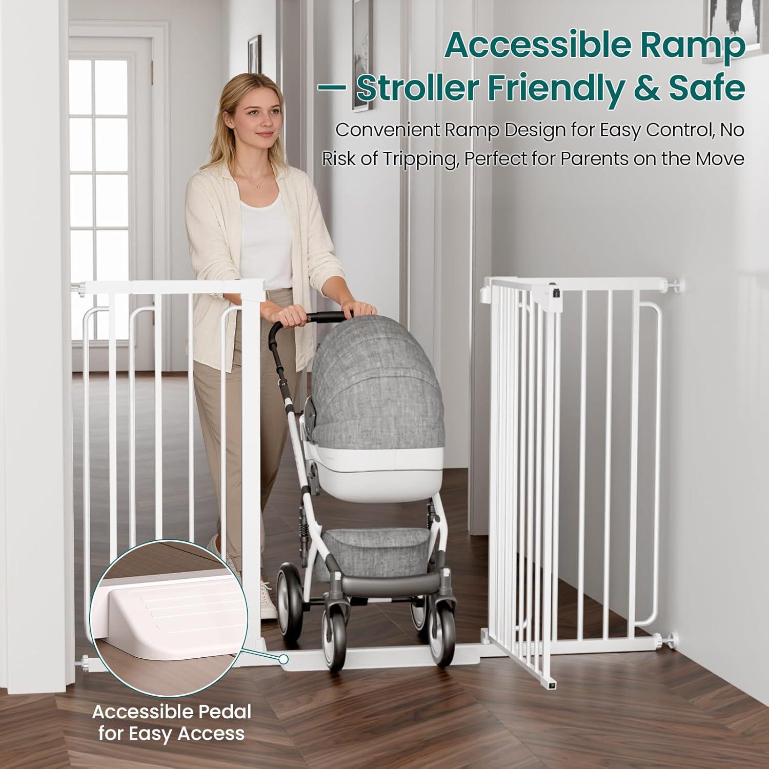 Durable Steel Frame with Step-Over Ramp: Built from sturdy steel, this gate is designed to handle the daily demands of active homes with children and pets. The included step-over ramp ensures easy pass-through, providing added convenience when navigating the gate.