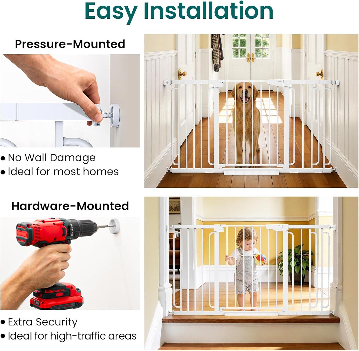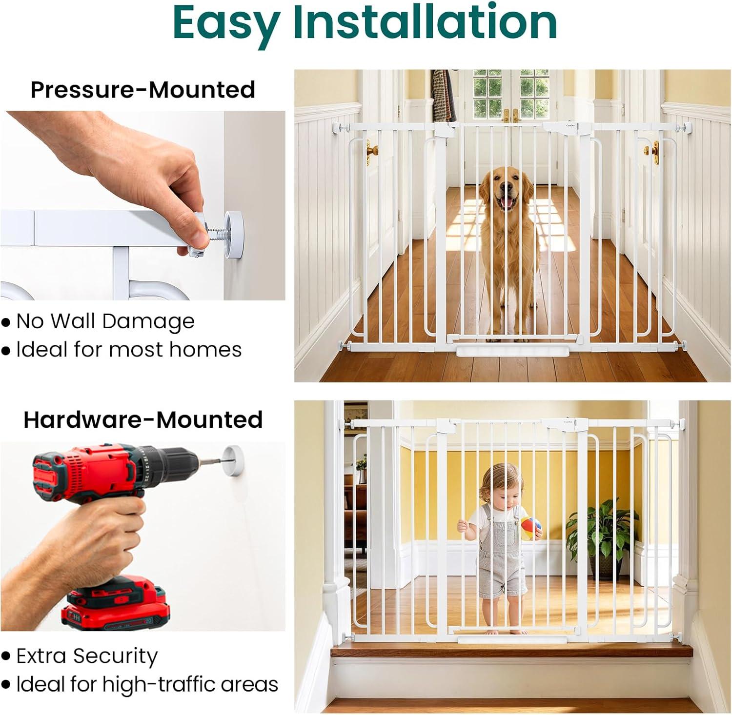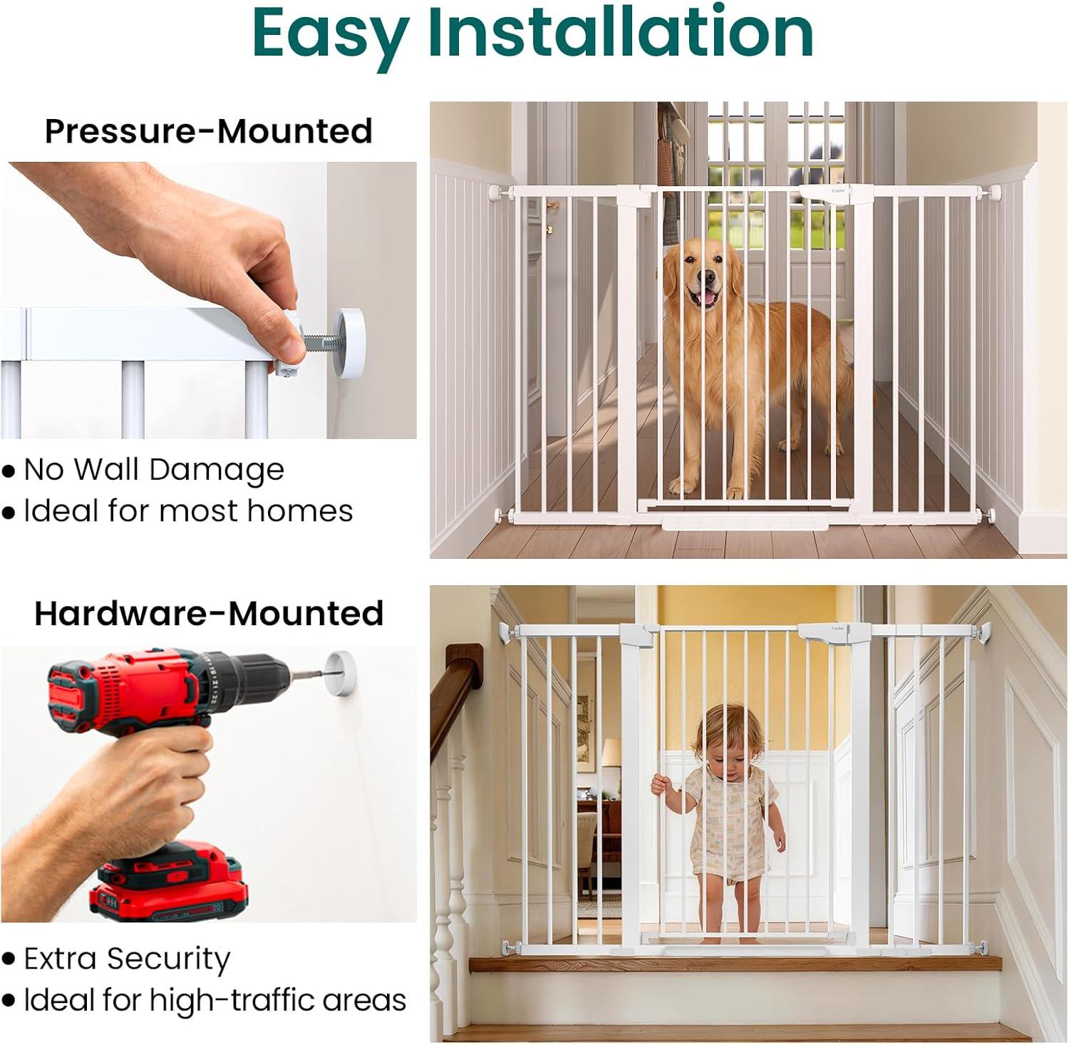 Easy Installation with Pressure or Hardware Mounting Options: Set up the gate quickly using the pressure-mount system for tool-free installation in doorways and hallways. For added security in high-traffic areas, such as stairs, use the hardware-mount option. Y-bolts are included to ensure a secure fit on round banisters.