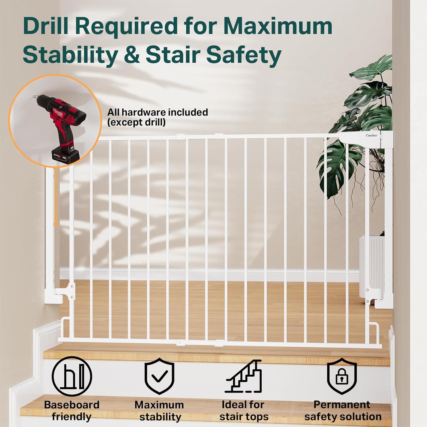 【Drill-Mounted for Maximum Safety – Strongest Protection for Stairs】This gate must be hardware mounted with drilling (not pressure installed). Drilling provides maximum strength, making it the safest choice for the top of stairs to protect your child. For drywall, always anchor screws into a stud. Not suitable for metal surfaces.