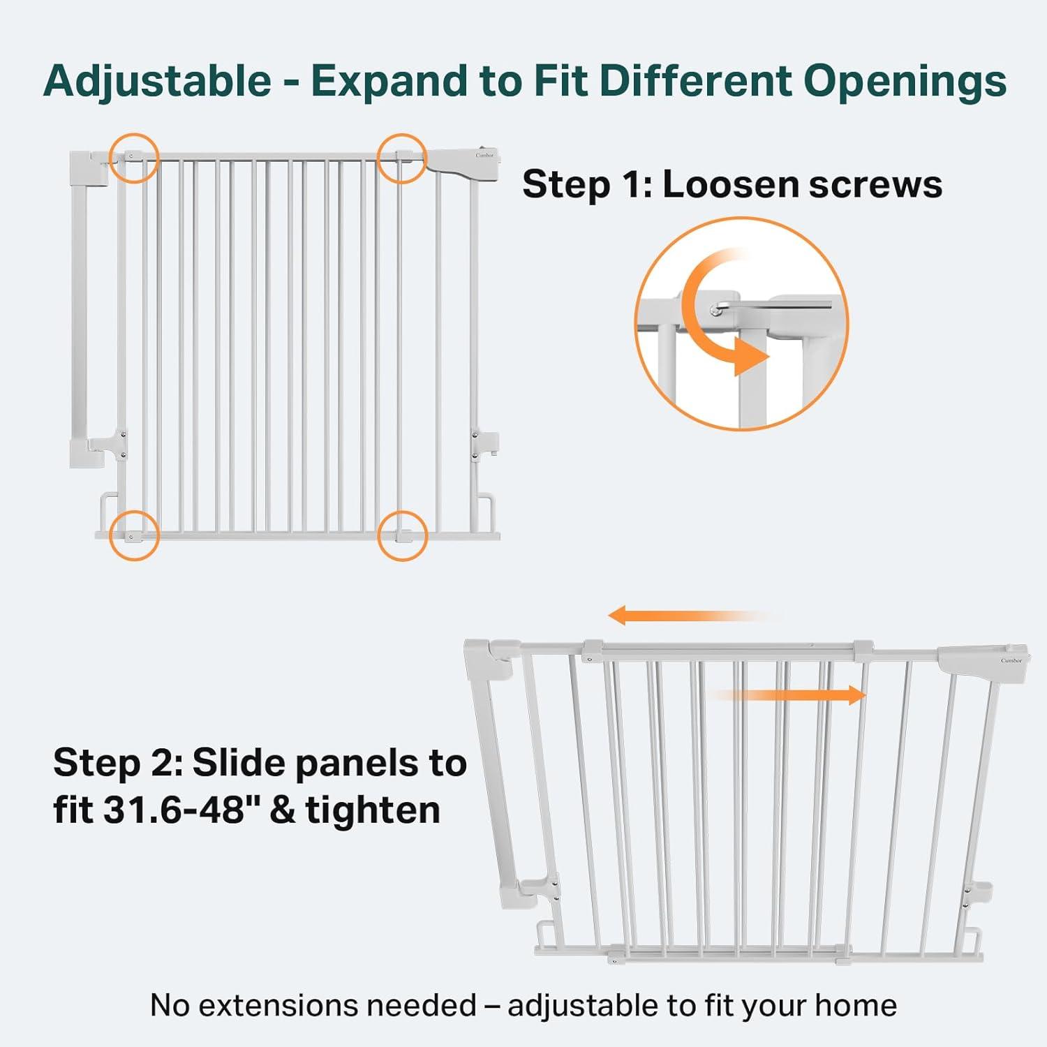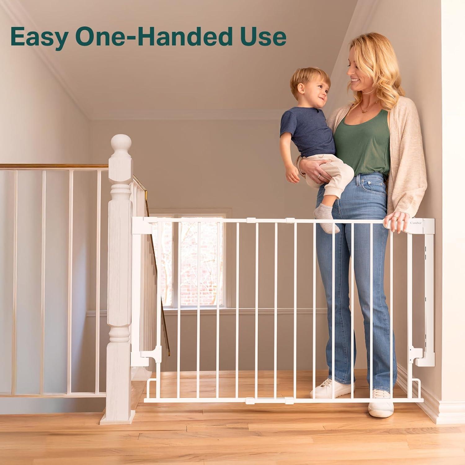 【Durable Build & Double-Lock Safety – With Curved Sides for Extra Protection】Cumbor dog gate includes a double-lock safety system that prevents toddlers from opening it easily. Made from high-quality materials, it ensures durability and reliable protection