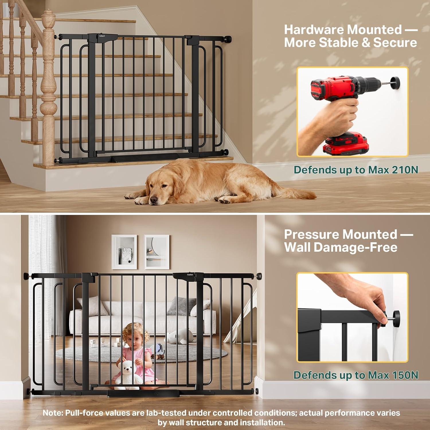 Flexible Mounting, Stress-Free Setup – Choose hardware mounting for extra security at the top of stairs, or pressure mounting for rental-friendly wall protection, letting you install the gate safely in more locations around your home.