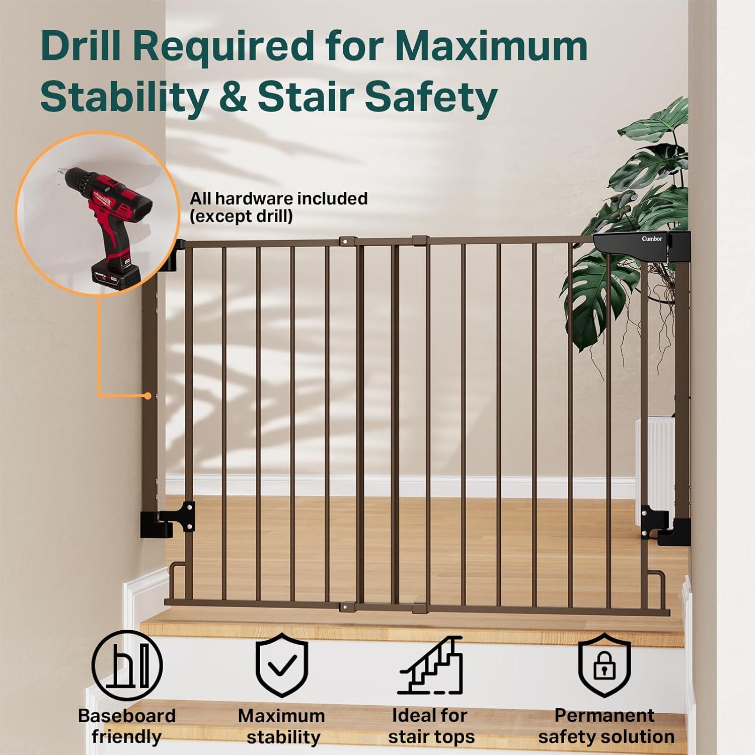 Cumbor 35.1-55in No Bottom Bar Baby Gate for Stairs, 2-in-1 Auto Close Dog Gate Indoor, Hardware Mounted Pet Gate for Doorways with Large Walk Thru Door, Child-Proof Safety Gate for Kids (White)(Brown)