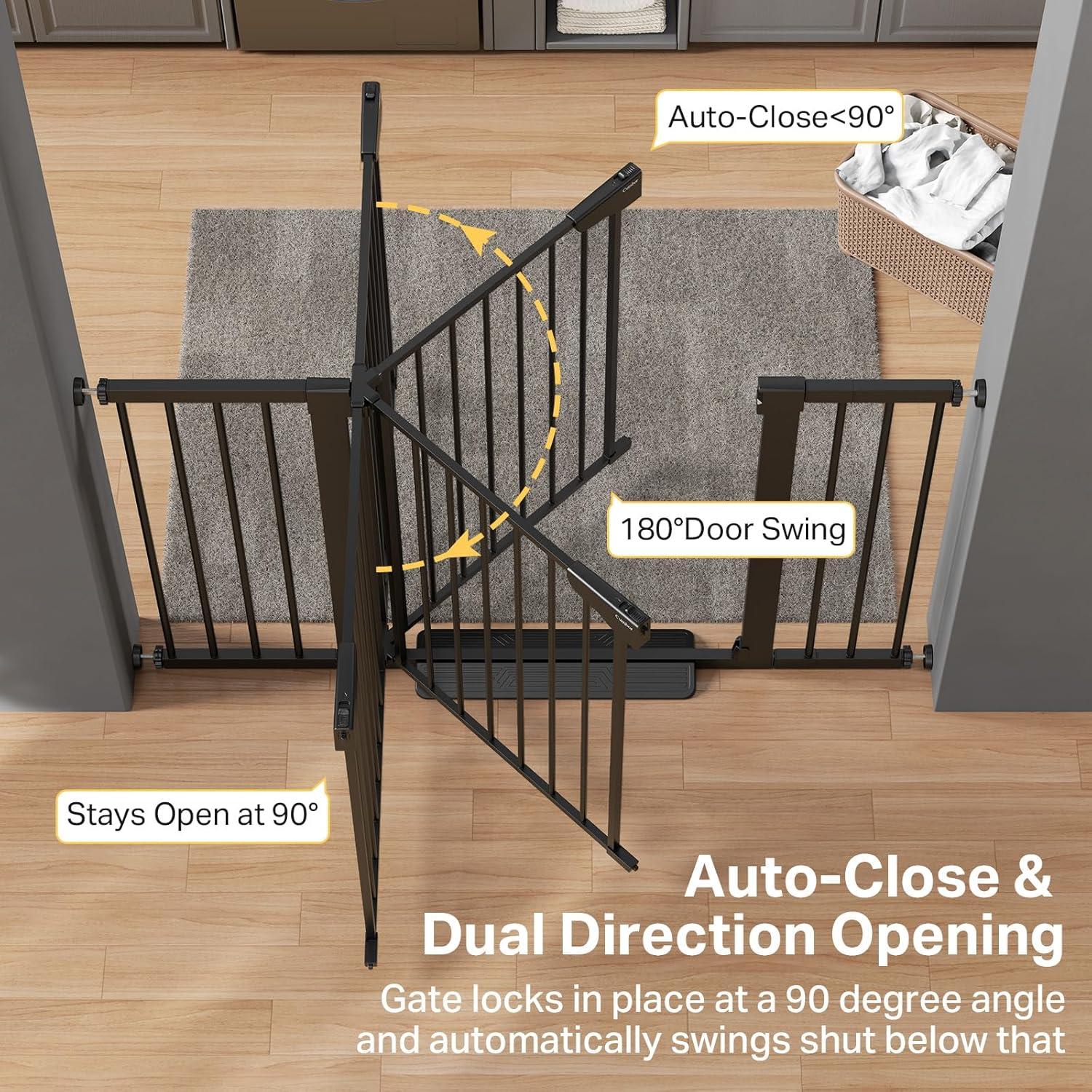【Single-Hand Operation】This tall baby gate will automatically close behind you to keep your hands free, locks at 90° to provide multiple pass throughs, and even double locks to prevent kids from opening it. And all with one-hand operation.